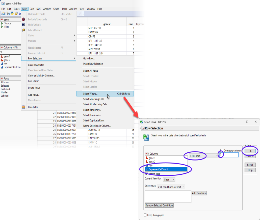 This action highlights all of the rows in the genes.jmp table with values smaller than "3" in the ExpressedCellCount column.