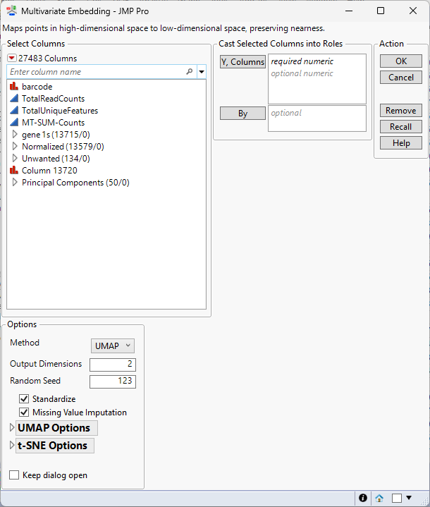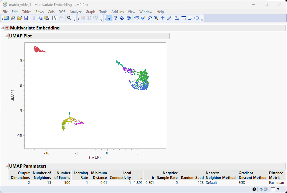 The Multivariate Embedding platform enables you to map data from very high dimensional spaces to a low dimensional space. The Multivariate Embedding platform uses either the t-Distributed Stochastic Neighbor Embedding (t-SNE) or the Uniform Manifold Approximation and Projection (UMAP) methods. Refer to Multivariate Embedding for more information.