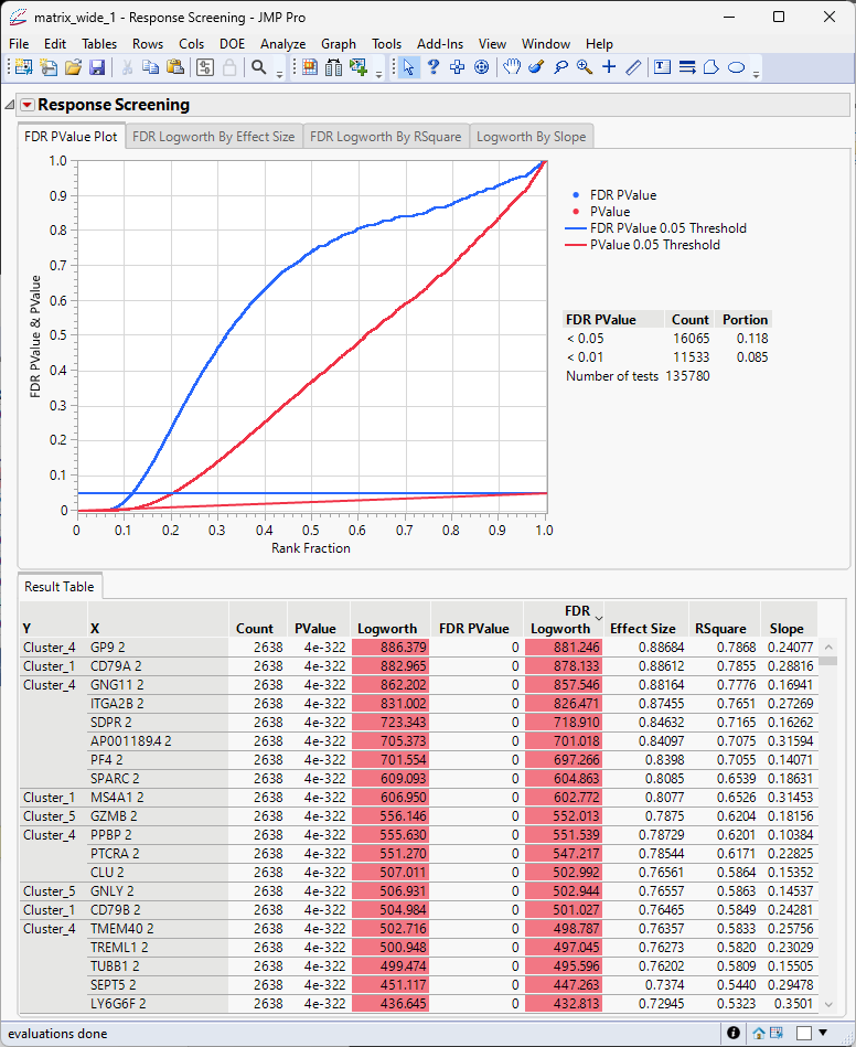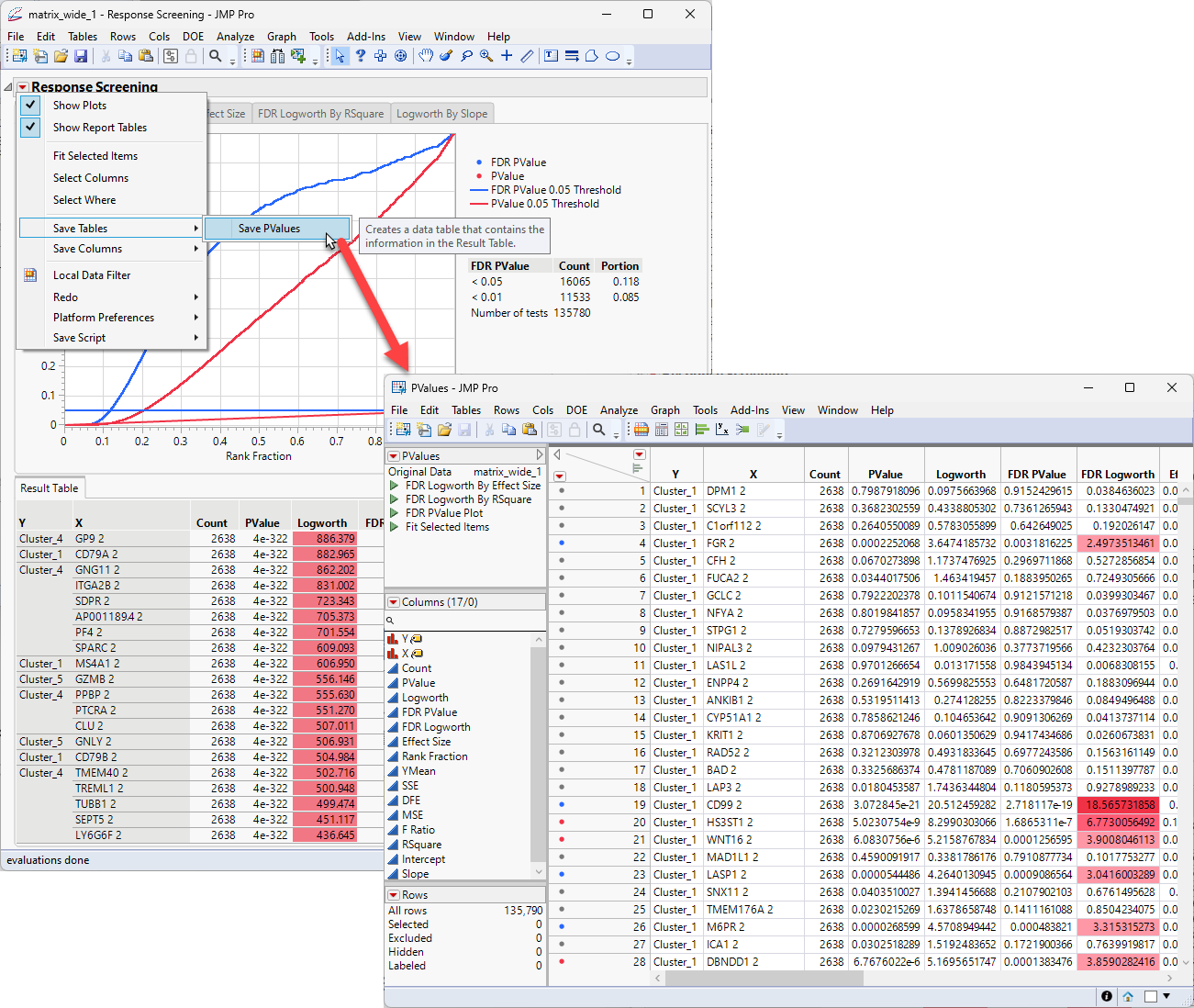 | 8 | Click and select Save Tables > Save Pvalues to save out the Results Table as a separate Pvalues JMP table. |