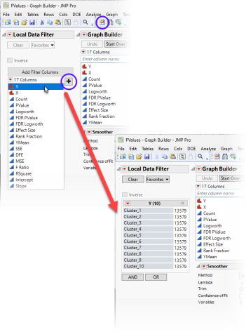| 8 | Click on the Local Data Filter (circled above) to add the Local Data Filter to the graph. Select the Y column and click to add the Y column as a filter. |