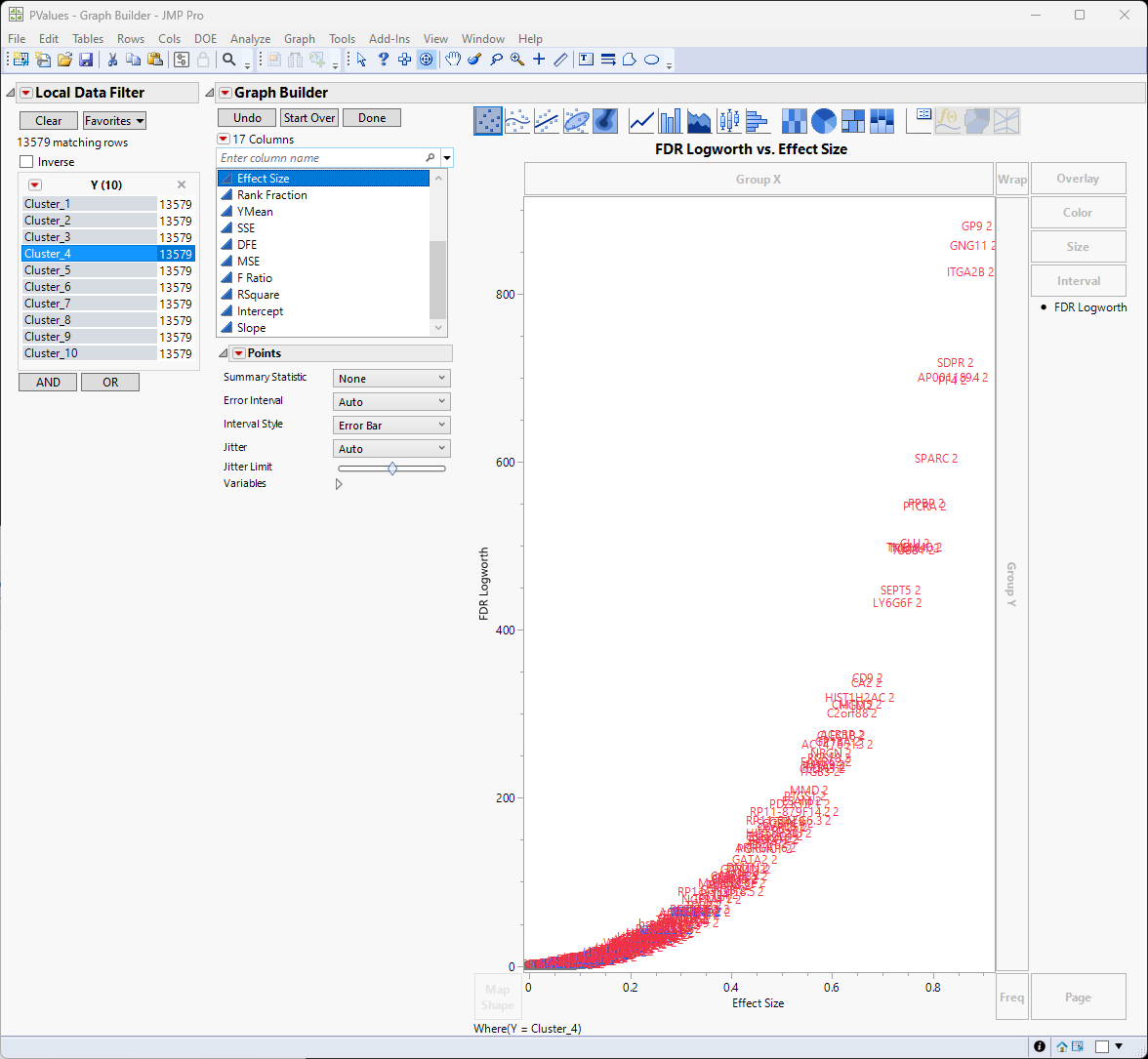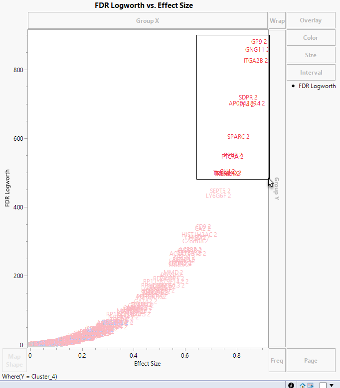 Because, in JMP, graphs and tables are tied together, selecting these genes in the graph also selects them in the table.