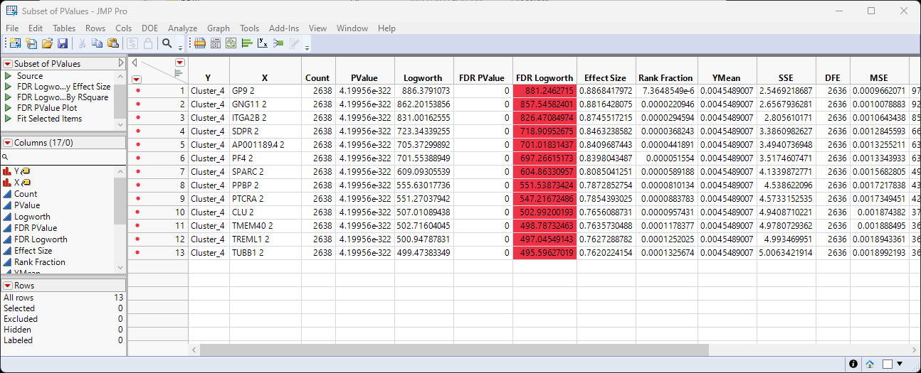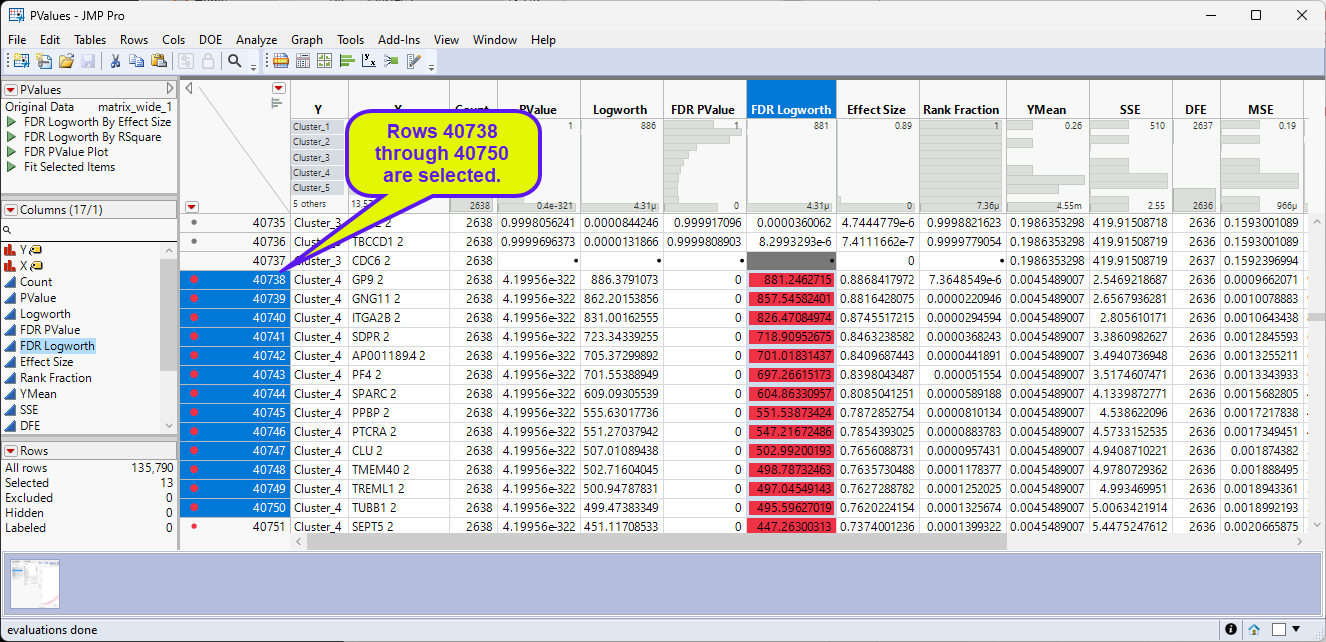 | 8 | Scroll down the PValues table until you come to the selected rows. |