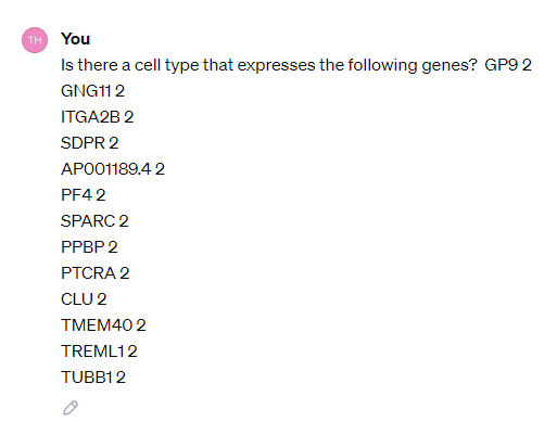 | 8 | Open a browser and navigate to one of the on-line AI utilities, such as ChatGPT and post the following query: Is there a cell type that expresses the following genes? and then paste the contents of the X column. |