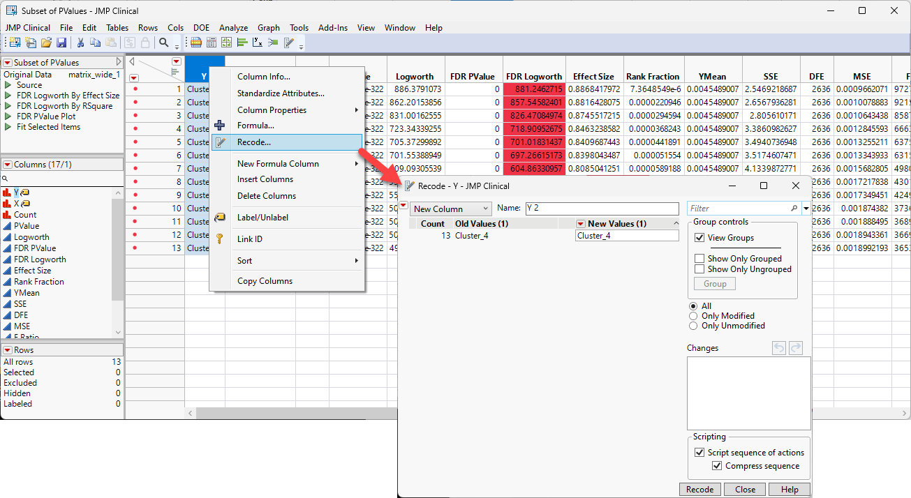 | 8 | Right-click on the Y column header and select Recode to open the Recode window. |