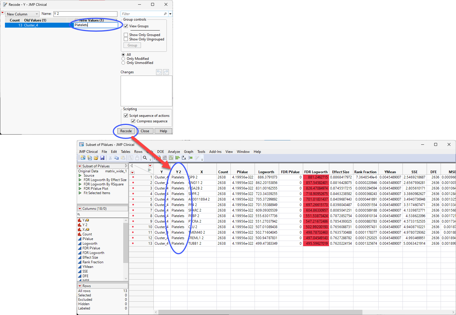 According to the ChatGPT search, all of the genes are involved in platelet structure and function. You can use JMP's column recode function to label the rows of the subset table.
