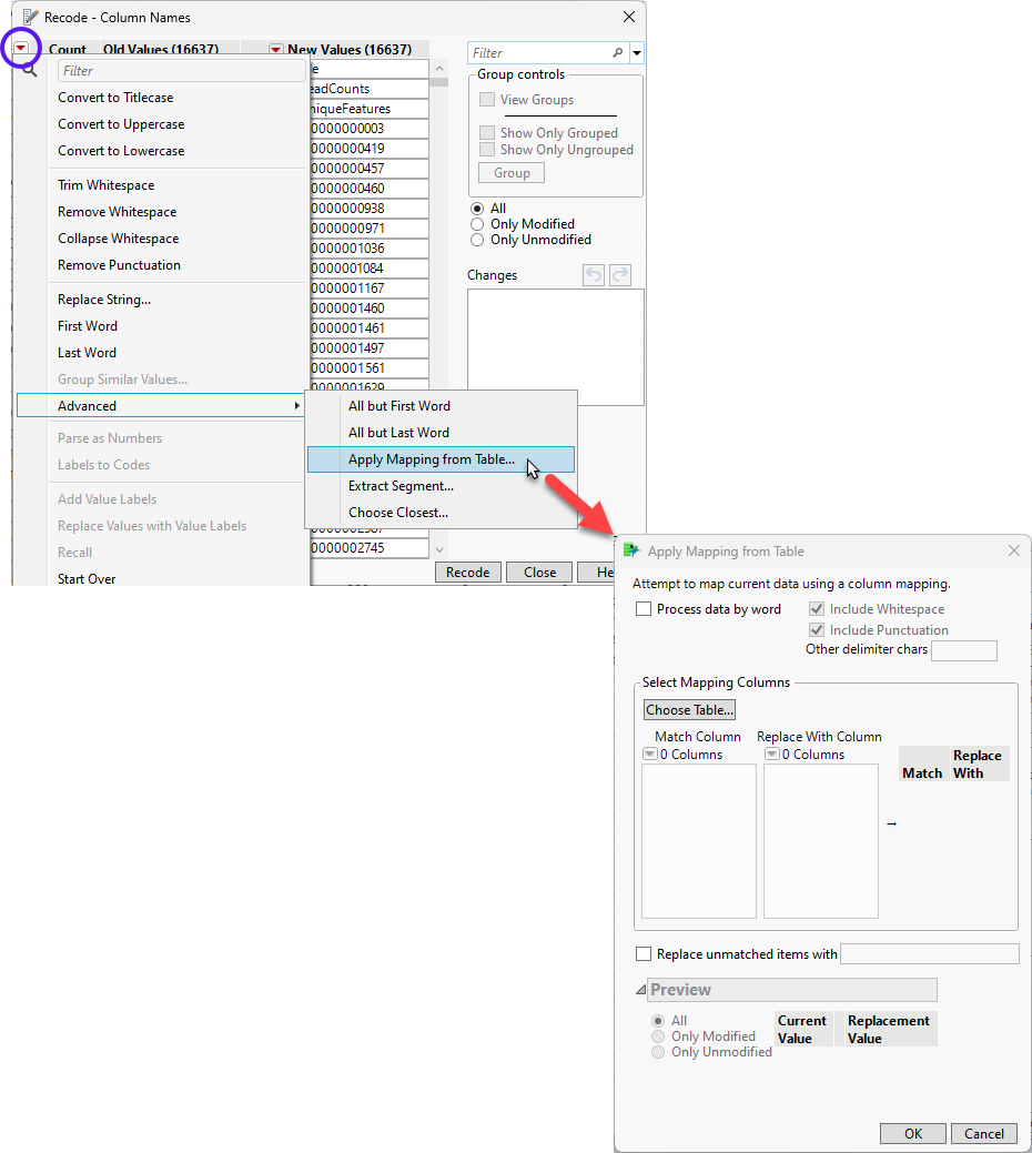 | 8 | Click the red triangle on the Recode window and select Advanced > Apply Mapping from Table to bring up the Apply Mapping from Table window. |