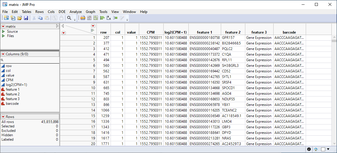 The matrix_wide.jmp table shown above is a dense table with all cells included. Most of the cells contain zeros, indicating no counts were registered. Nonzero values represent the log2(1+CPM) transform of the original data. This transform should generally be appropriate for single-cell RNA sequencing count data1.