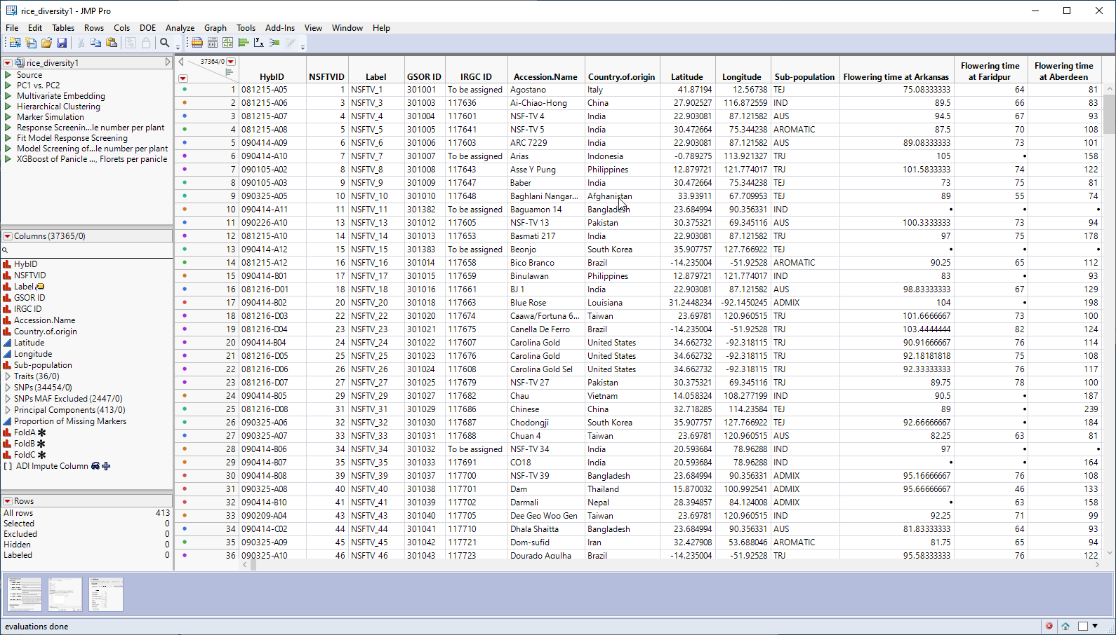 The genotype data used in this chapter is from a genome-wide association study of trait and genotype data from rice (Oryza sativa) cultivars by Zhao, et al., 20111. The data was kindly provided by the authors, opened in JMP, and saved as the rice_diversity1.jmp table shown below.