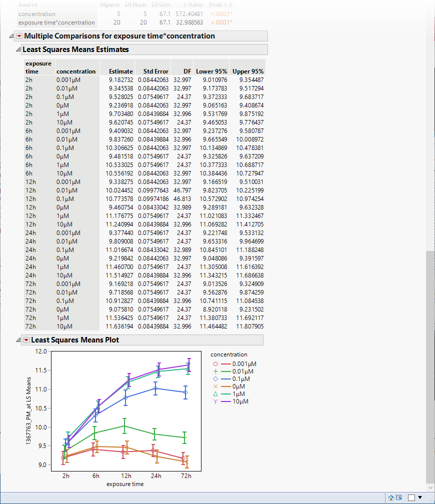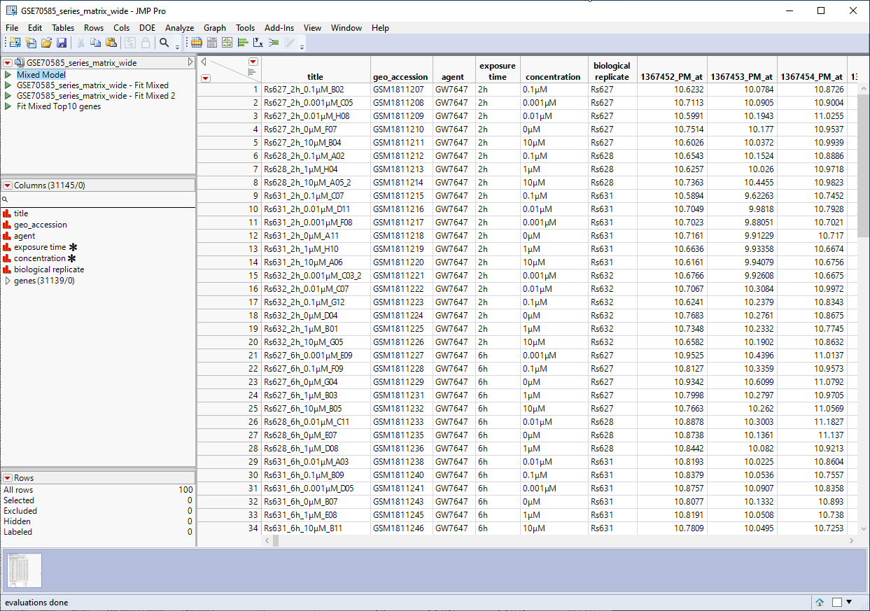 This example uses the GSE70585_wide.jmp table described above. This table contains in vitro data from primary cultured rat hepatocytes incubated for 2h to 72 h with up to 5 concentrations of PPARa and represents a more complex experimental design.