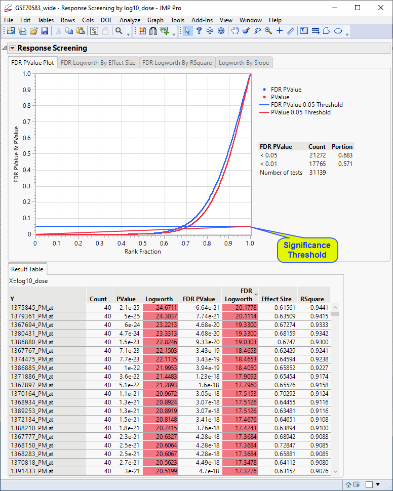 Note: Because Logworth values represent the -log10 FDR p-value, the observation is effectively the inverse of the FDR p-value. Hence, observations above the threshold represent changes in expression.