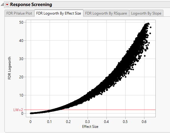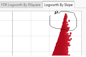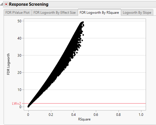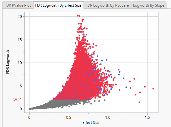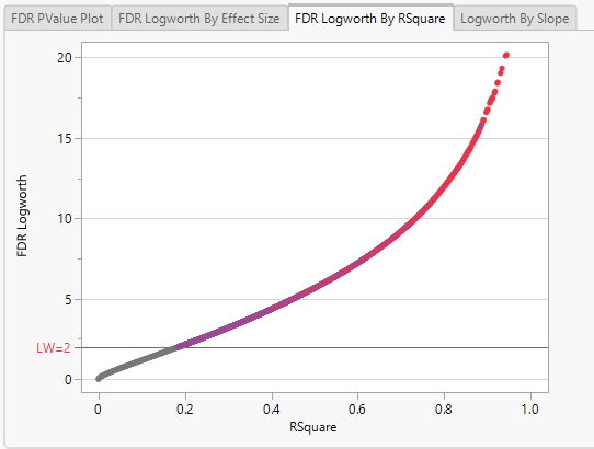 In this plot, the genes with p-values (and FDR p-values) below the 0.05 significance threshold are likely to exhibit significant differential expression. The genes with p-values (and FDR p-values) above the significance threshold are not. This is also indicated in the FDR Logworth by Effect Size and FDR Logworth by R Square plots.