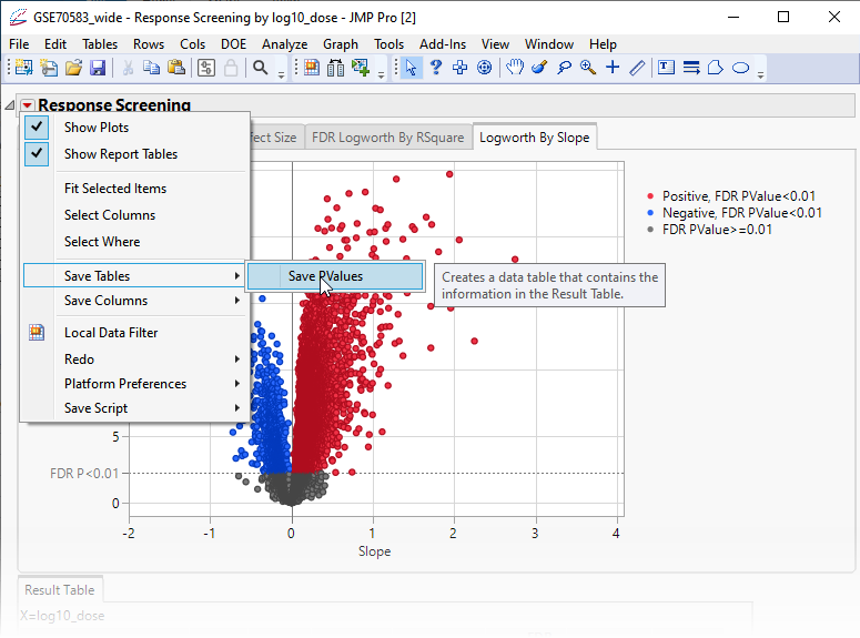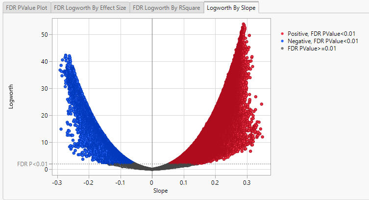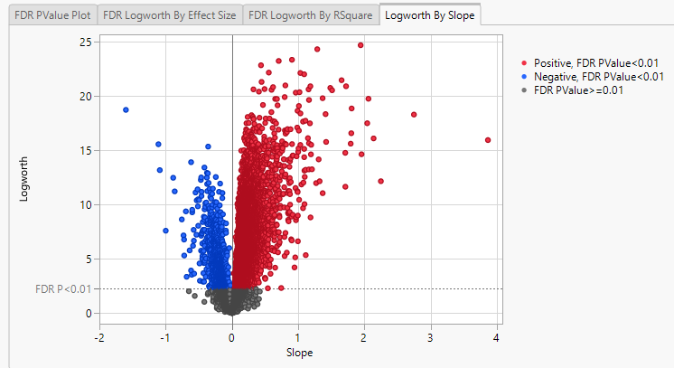 Finally, plotting the Logworth values by the slope of the regression yields a so-called Volcano Plot.
