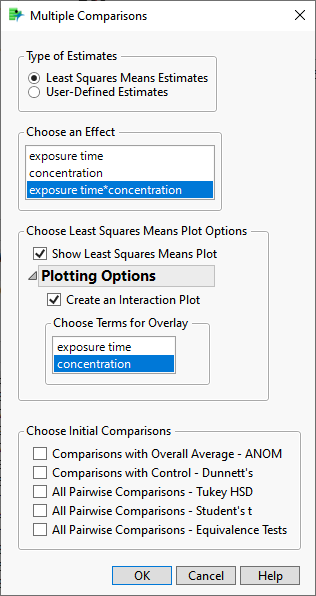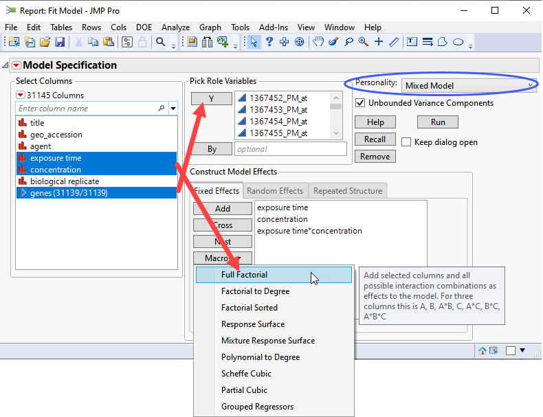 | 8 | Select exposure time, and concentration. Click and select Full Factorial to add each column and their interactions to the Fixed Effects pane. |
