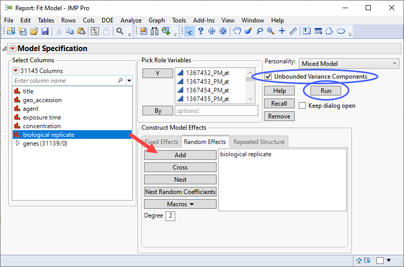 | 8 | Click on the Random Effects tab. Select biological replicateand click to specify it as a random effect. |