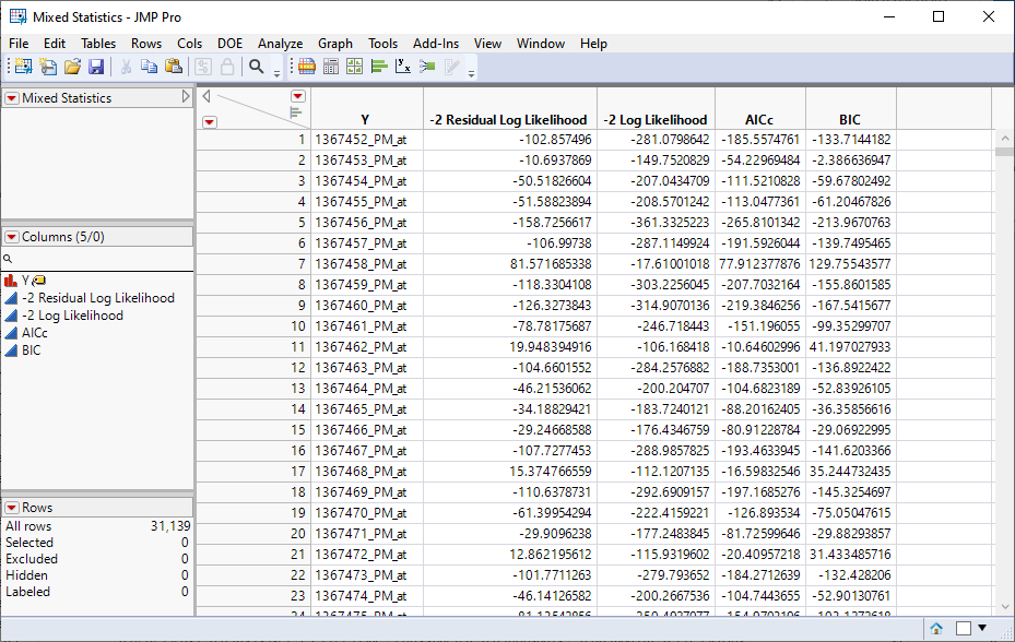 | 1 | Mixed Statistics.jmp: This table lists statistics on how well each model was fit. |