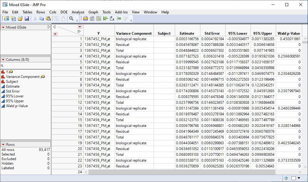 | 2 | Mixed GSide.jmp: This table lists variance components estimates. |