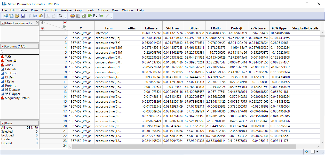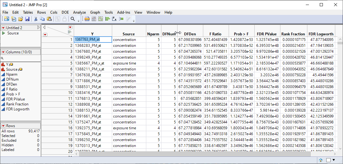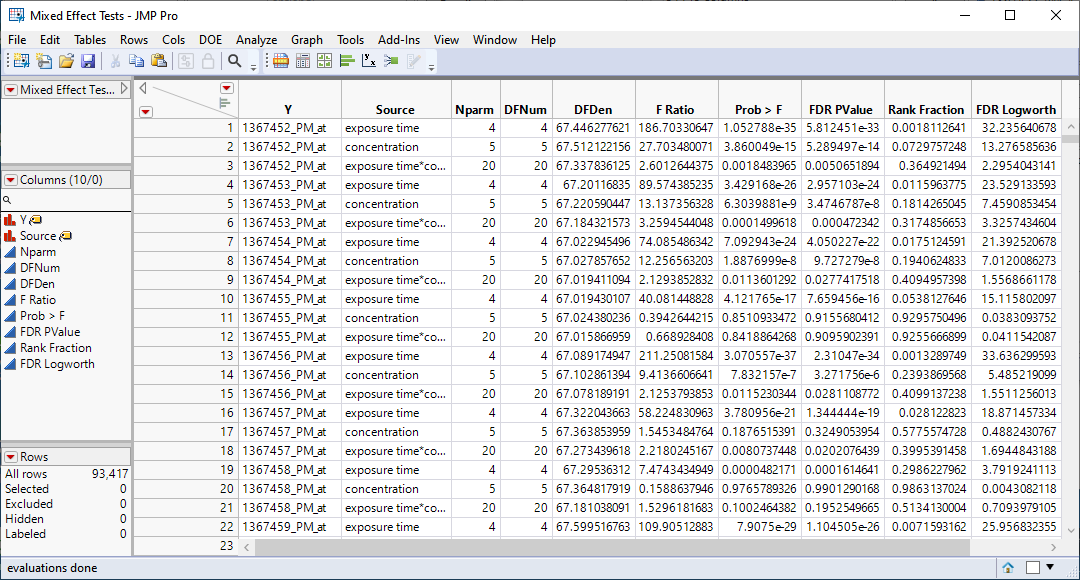 | 4 | Mixed Effects Tests.jmp: This table lists statistics for each of the gene expression measurements. |
