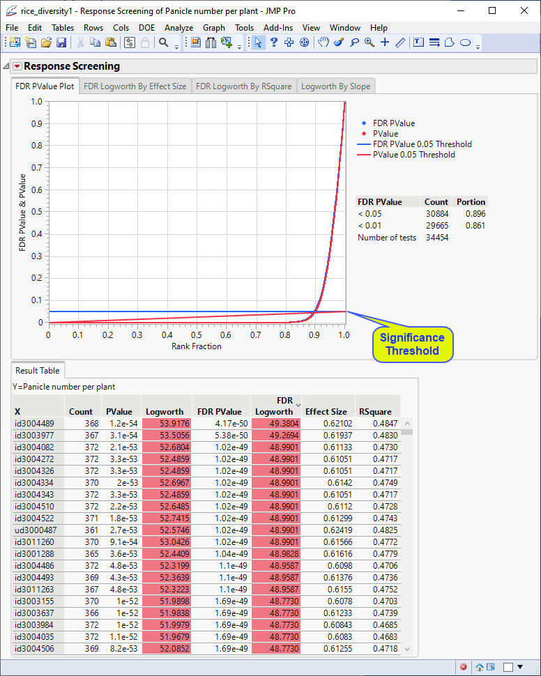 In this plot, the majority of SNPs have p-values (and FDR p-values) below the 0.05 significance threshold. This plot indicates that the majority of SNPs are associated with some genetic effect on the number of panicles per plant. (Refer to The Response Screening Report for more information.) This is also seen in the FDR Logworth by Effect Size and FDR Logworth by R Square plots.