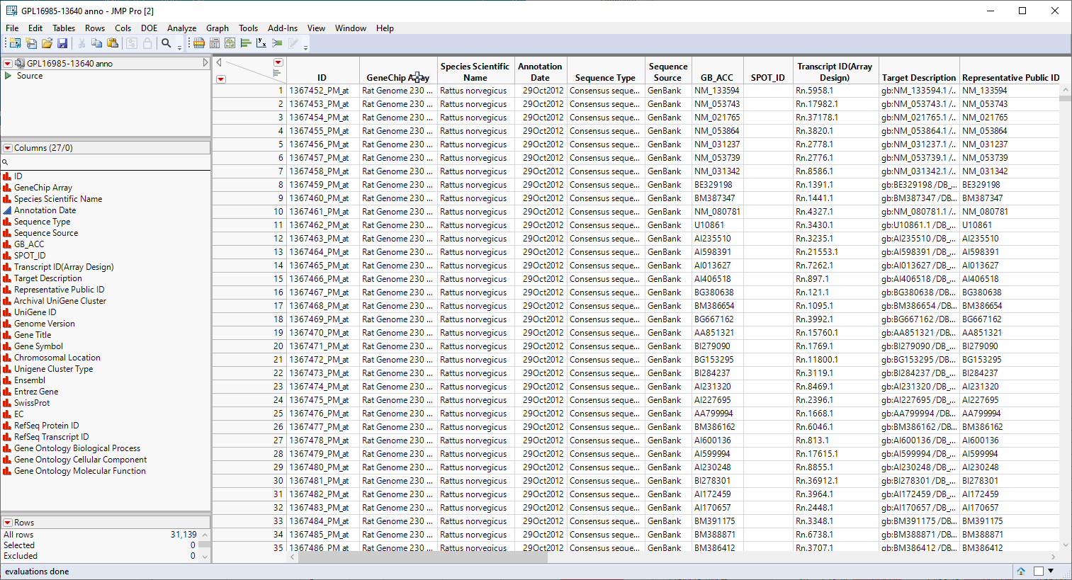Genomic analysis does not just stop once the statistics have led you to identifying one or more genes that are responding to a particular stimulus or at a particular point in development. at this point, it is necessary to connect those genes to the biological systems and pathways of which they are a part. Much of this information is found in annotation data sets provided by the public databases or manufacturers in formats that are compatible with the chips and analysis systems used to study gene expression. The GPL16985-13640 anno.jmp table, shown below, contains a variety of biological and annotation information about the genes in this experiment, including gene ID, chromosomal location, pathway information, etc.
