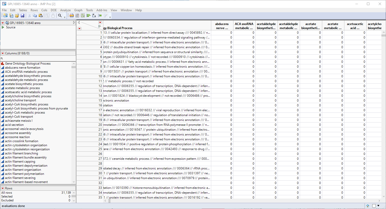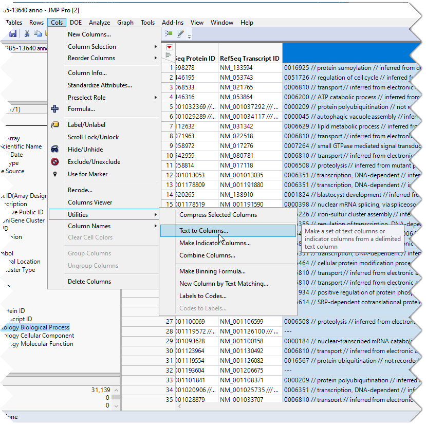 Note: If you examine the Gene Ontology Biological Process column in the figure above, you will note the numbers at the beginning of the pathway descriptions. JMP will create indicator columns for these numbers as well as the columns for the pathway names. You should delete all of the "numbered columns before proceeding.