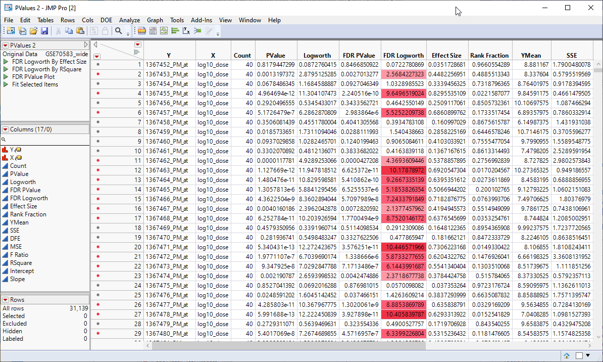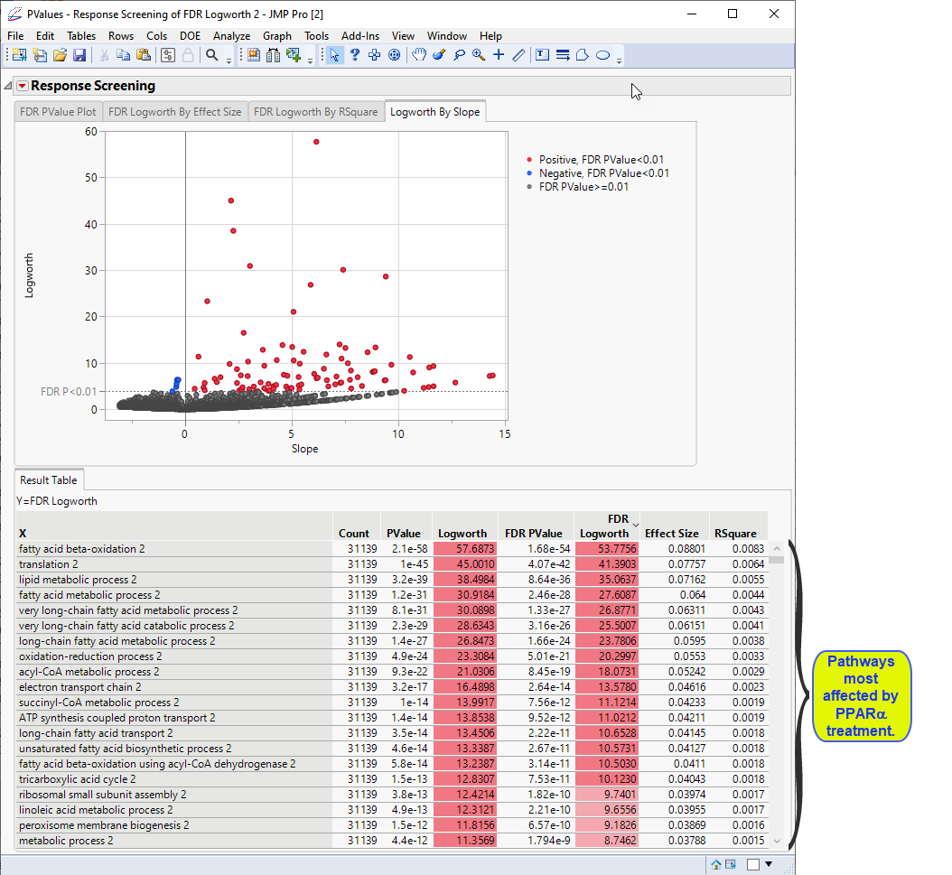We can use the FDR Logworth statistic in the Mixed Effects Test.jmp table to identify genes that are most affected by the PPARa treatment for further analysis.