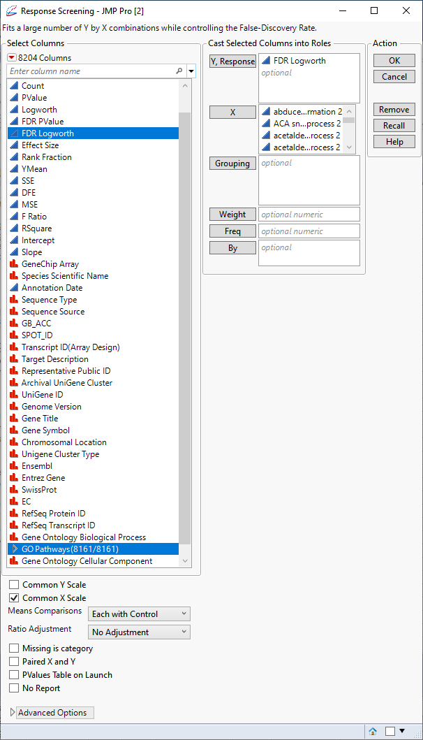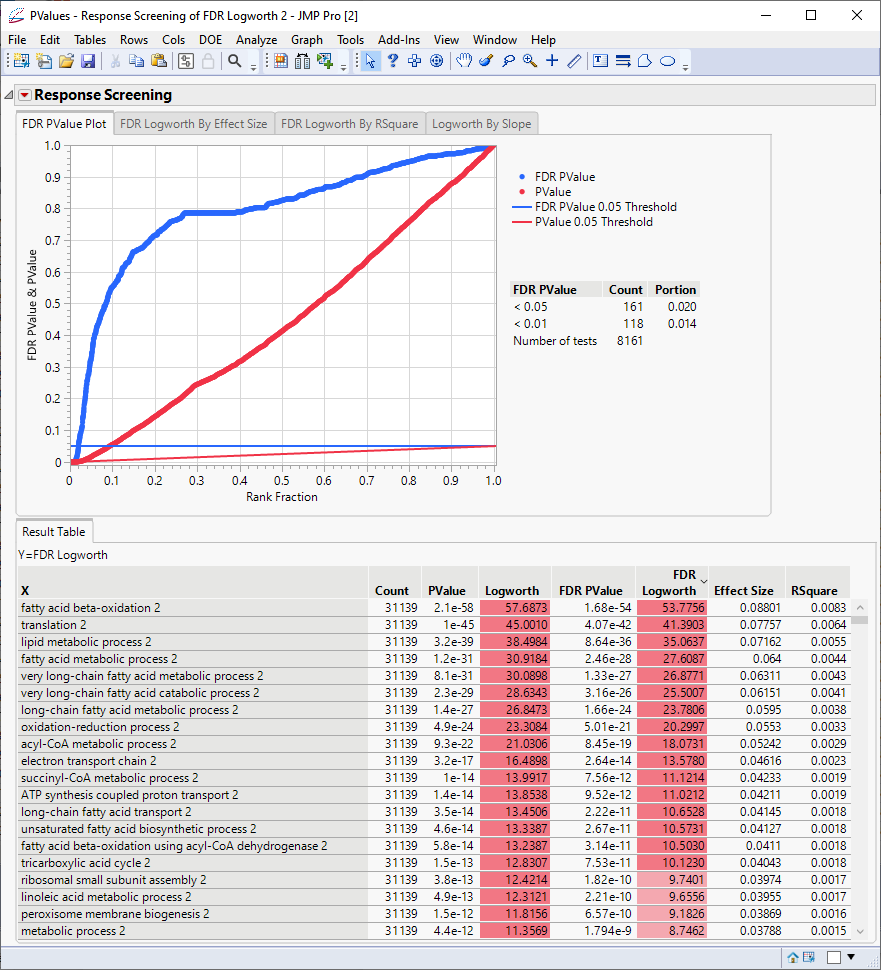 Now that we have added the annotation information along with the indicator columns to the PValues.jmp table, we can examine the association of the genes with the different pathways and determine the genes and pathways most affected by treatment of the cells with PPARa. To do this, we again use the Response Screening platform.