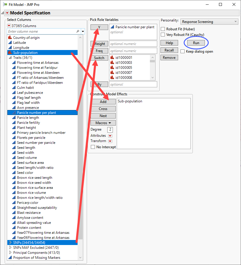 | 8 | Select Subpopulation and click to construct a model effect based on the subpopulation of the cultivars. |