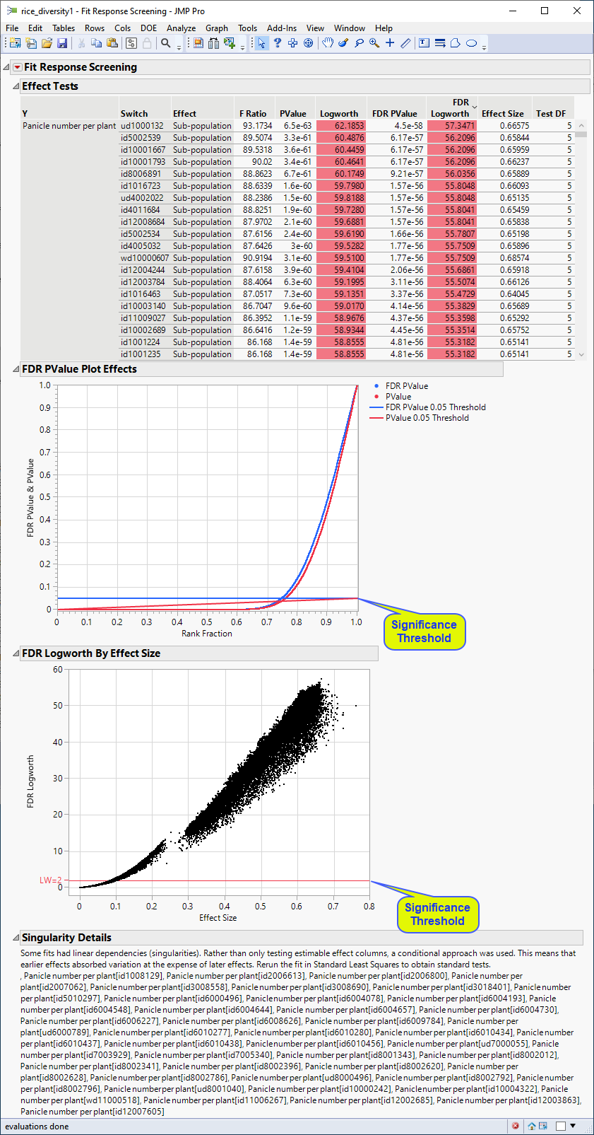 For more advanced linear statistical modeling and testing, the Fit Model platform with Response Screening personality enables specification of additional fixed effects in a large number of linear models. The effects can either be the same for every model or switched out for each model.