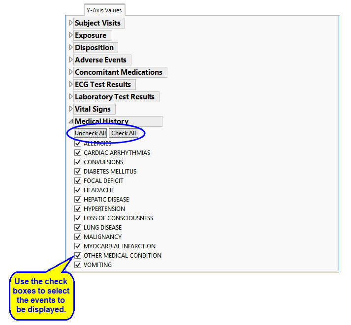 | • | y-Axis Values tab: These options enable you to control exactly what domain data are displayed in the displayed profiles on the General tab. Click on the triangle next to a domain (Medical History, for example) to expand it, and use the check boxes to remove or add items. and buttons (circled) are available for removing or adding entire domains. |
