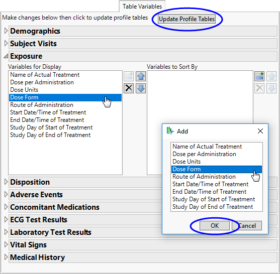 | • | Table Variables tab: These options enable you to control exactly what domain data are displayed and the order in which they are displayed in the Tables shown on the Tables tab. Click on the triangle next to a domain (Exposure, for example) to expand it. There are two sets of controls for each domain: one to specify the variables to display and the order to display them in the profiles, the second to specify which variables to sort the results by and the order in which to sort them. These are described below. |