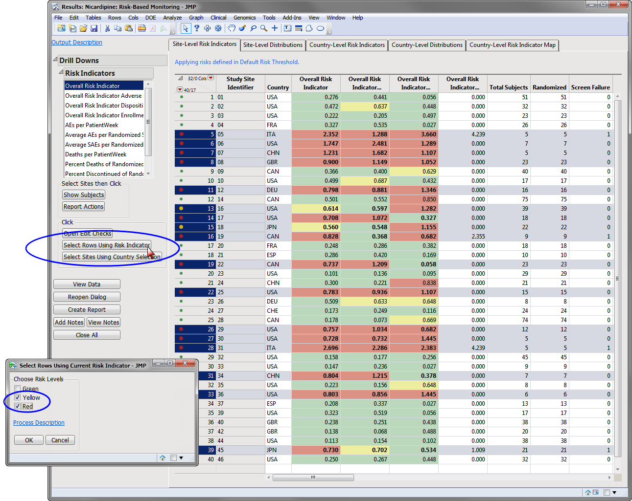In the following example, sites highlighted in red (high risk) and yellow (intermediate risk) were selected using the -down button, as shown below: