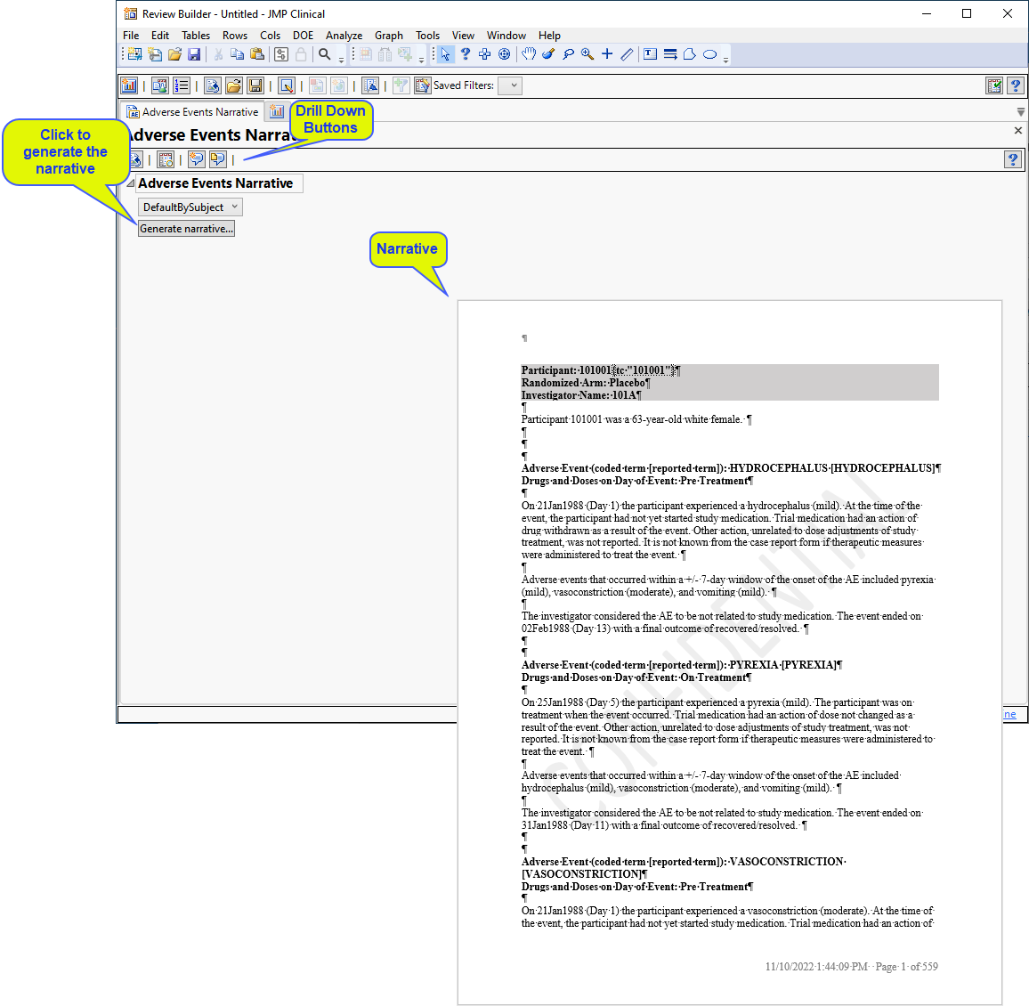A narrative, containing descriptions of all of the observed adverse events, is generated for each patient. The narrative for the Nicardipine example is 3134 pages long. In the example shown here, subject 101001 experienced 4 adverse events that are described over 2 pages.