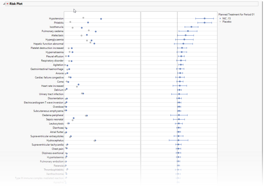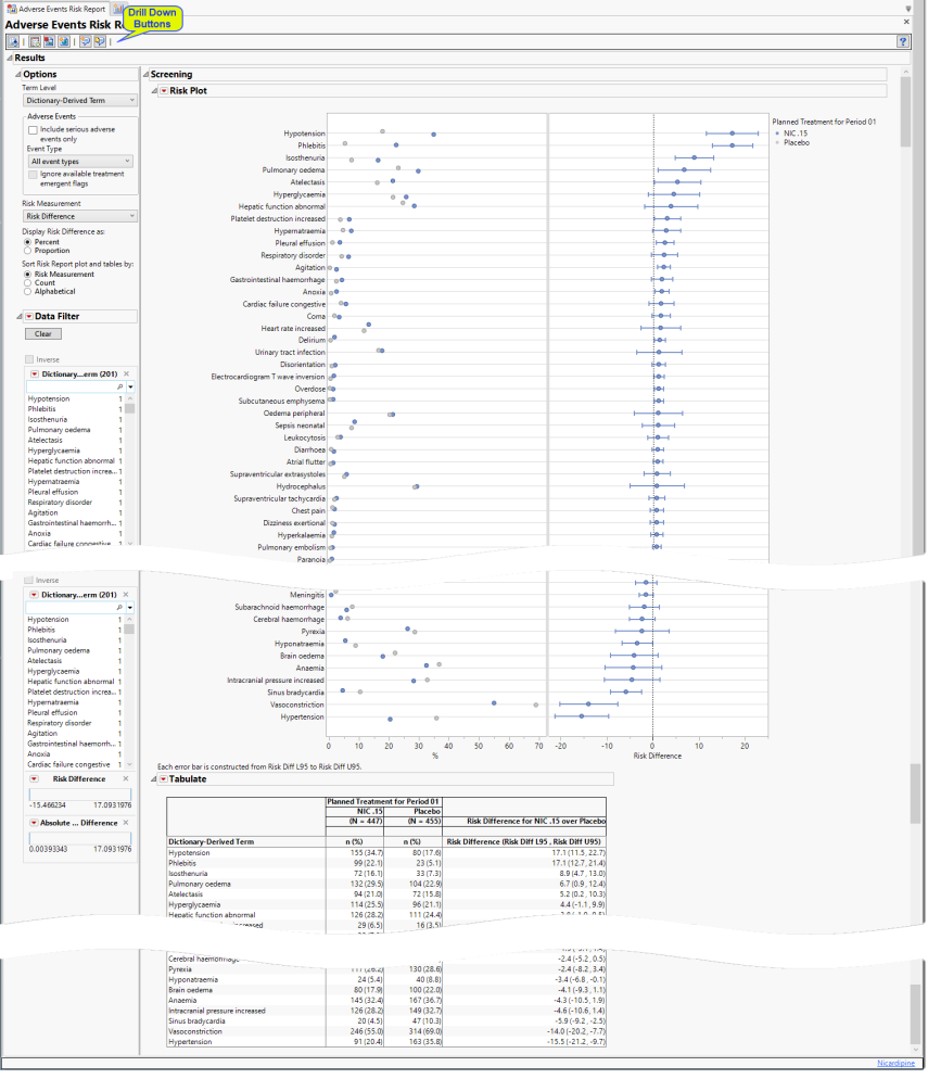 Running Adverse Events Risk Report using the Nicardipine sample data for risk differences generates the report shown below.