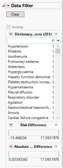 | • | The table presents an alternate view, listing the subject counts experiencing an event and the respective percent of subjects (in parentheses) on each treatment arm, as well as the risk difference and 95% confidence interval (in parentheses) for the terms (or those terms falling under selected groups, when specified). |