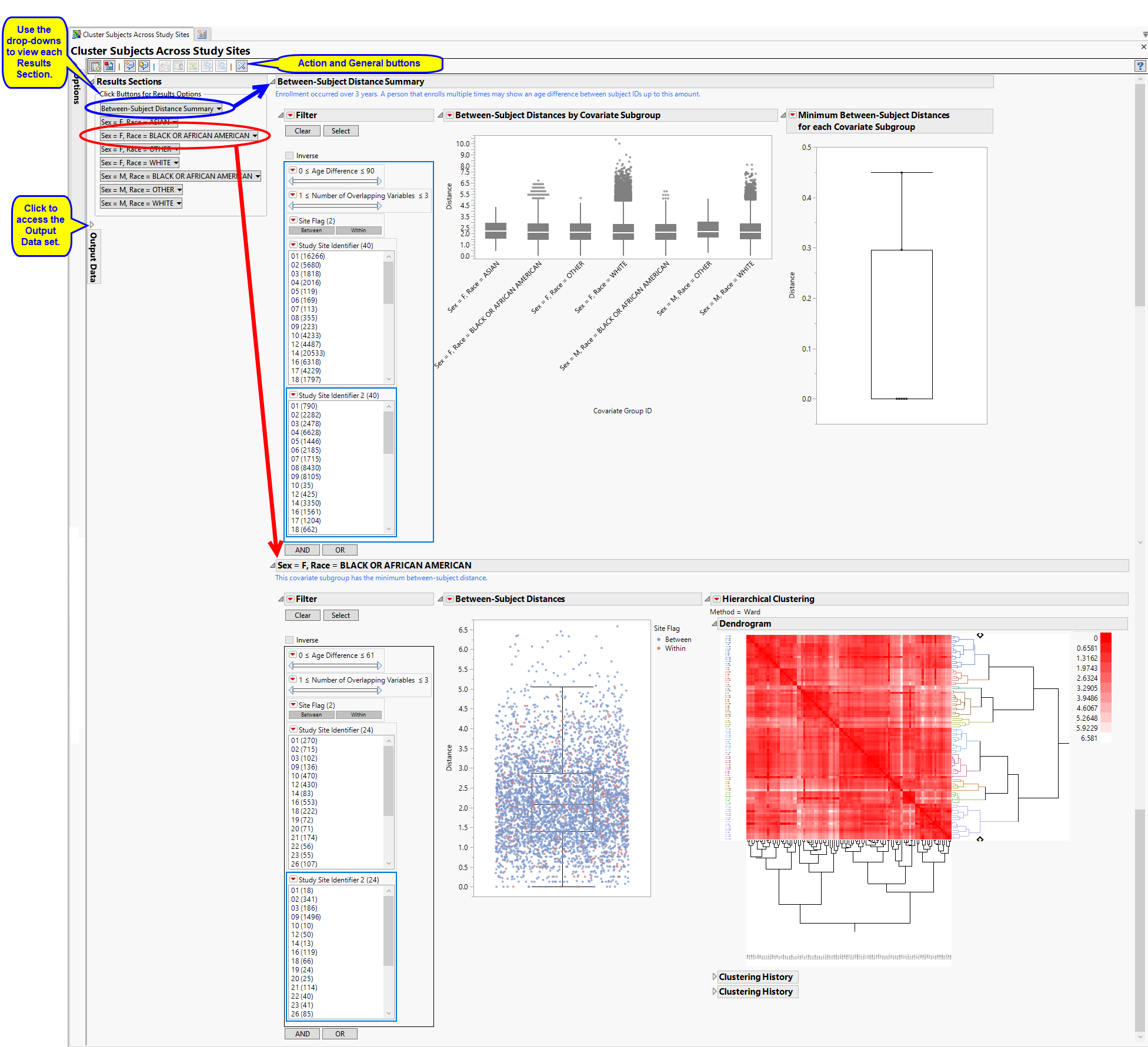 One or more Subgroup Clustering sections: Only one section is opened initially. The name of this section is dependent on the covariate values used (as specified in the Cluster subjects matching these criteria panel) and the subgroup that is identified with the minimum pairwise distance. Other subgroup results can be opened from the Results Sections menu.