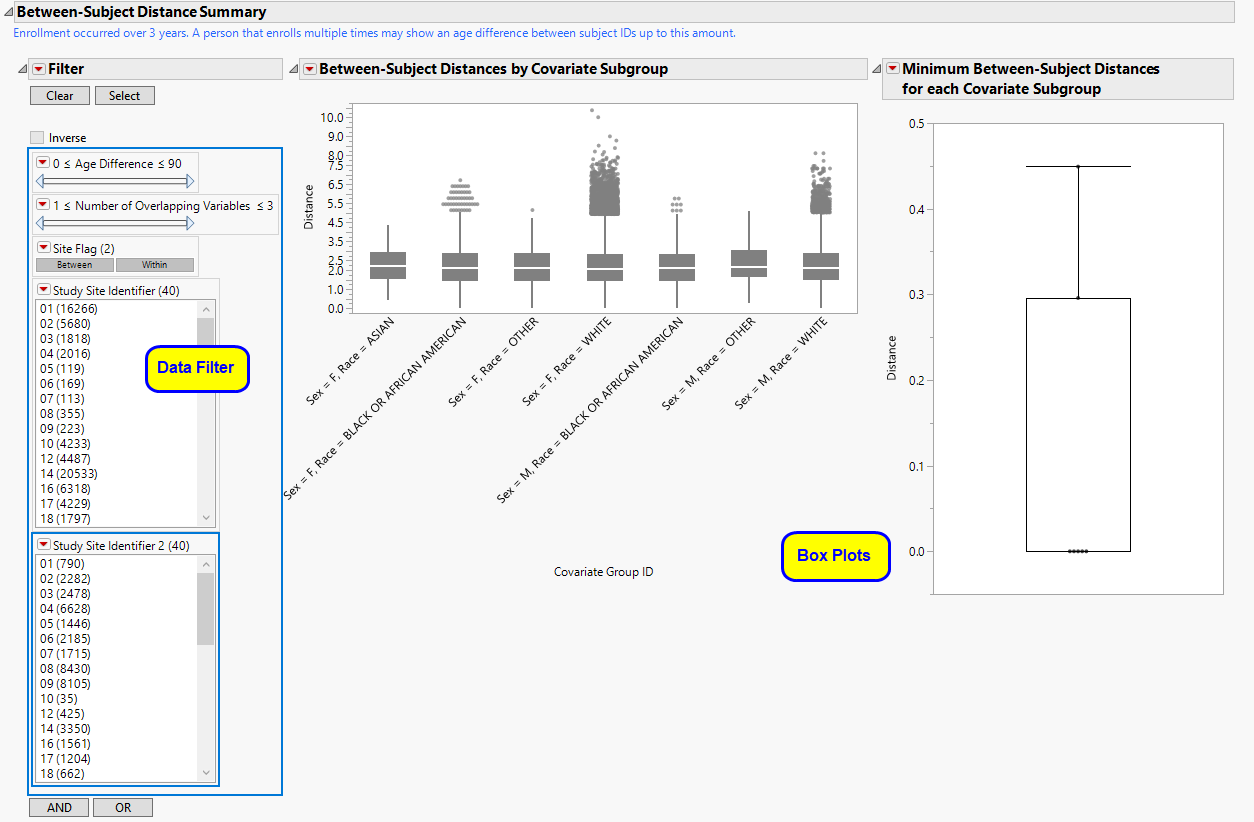 | • | One Box Plot of Minimum Between-Subject Distances for Each Site. The minimum distance from each covariate subgroup is presented in the box plot to the right. |