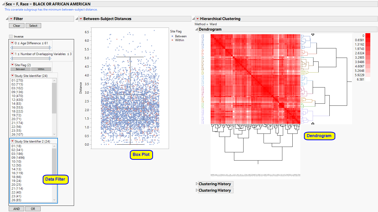 By default, specified subjects are clustered by Sex and Race using Ward’s Hierarchical Clustering Method. Available options enable you to change both the criteria for clustering (adding Country, for example) and the clustering method used.