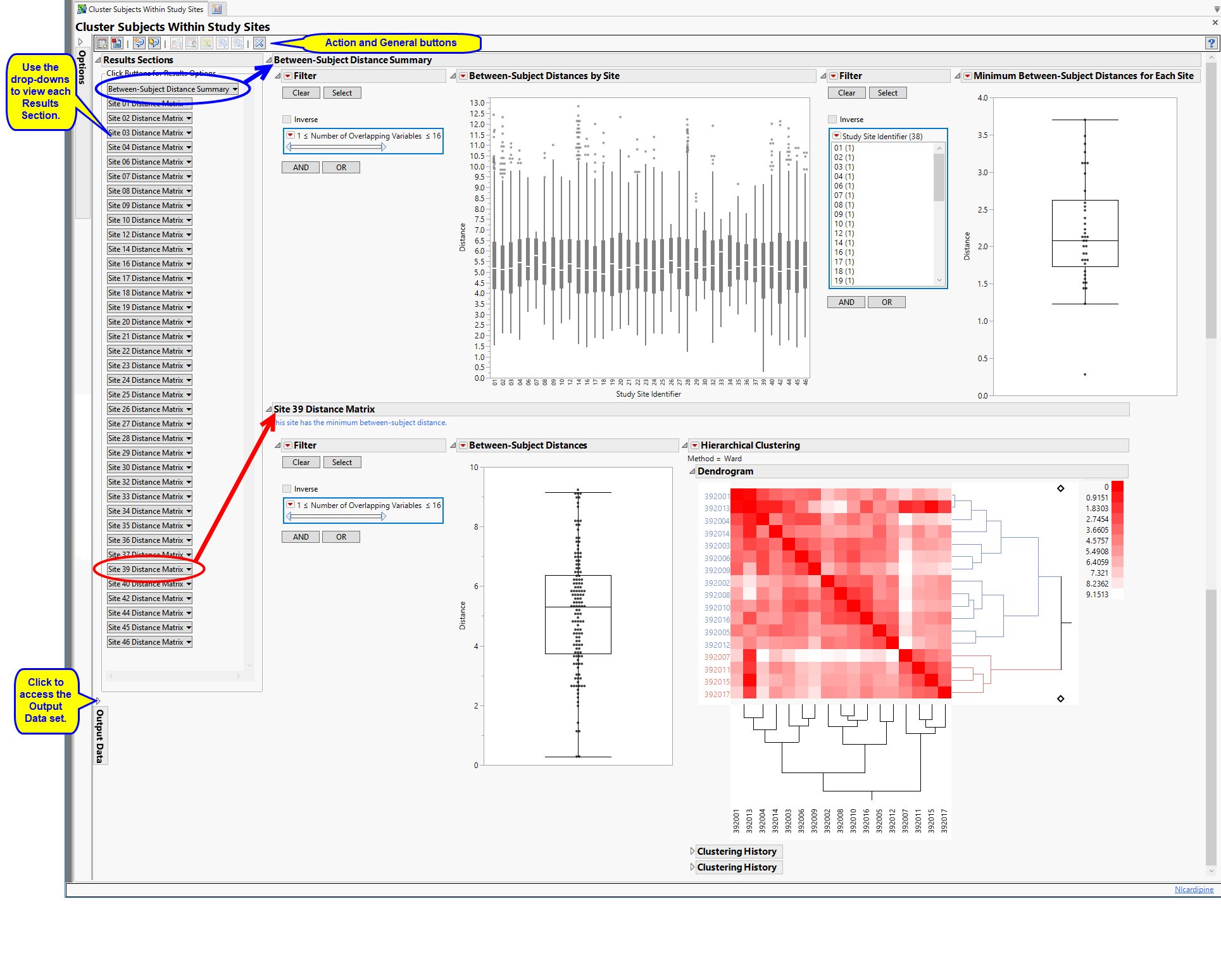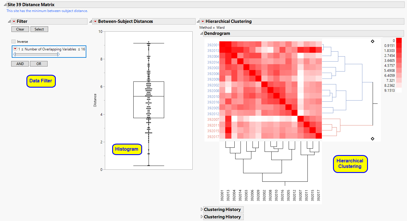 Summarizes the distribution of all pairwise Euclidian distances within site XX. Small pairwise distances can be selected in the Box Plot and highlighted in the Hierarchical Clustering Heat Map with the button.
