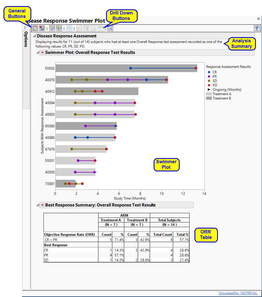 This process creates a disease response swimmer plot and tables around either the best or last recorded response rates and calculated objective response rate for solid tumor oncology clinical trials, representing RECIST evaluation from the RS domain. The output includes a swimmer plot for subjects who have responded favorably to treatment for solid lesion trials per RECIST criteria using CDISC recommended evaluation responses of Complete Response (CR), and Partial Response (PR). Optionally, subjects can be annotated with responses of Stable Disease (SD) and/or Progressive Disease (PD) as well. The results of these assessments are summarized based on selecting either the Best response per subject, based on preferred order: CR, PR, SD, PD for controlled terms, respectively, or Last recorded response. Using this summarized response, subject counts and percentages of response rates are displayed in a summary table split by Treatment Variable based on report selection. The objective response rate (the sum and percentage of subjects who had CR + PR assessment result) is also calculated and listed in the summary table.