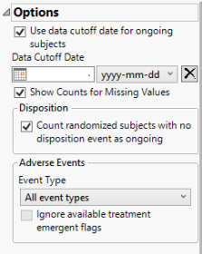 Check this box to count subjects who do not have a record in DS for either Completed or Discontinued as Ongoing for treatment and study status. Refer to to Count randomized subjects with no disposition events as ongoing for more information.
