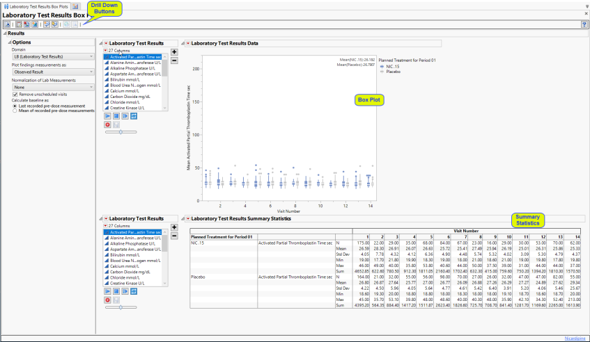 Each box plot set represents an xxTESTCD from the selected domain. For example, in the graph above, the first figure represents the change from baseline for APTT (Activated Partial Thromboplastin Time) at each visit for both treatment arms. The table presents the associated statistics.