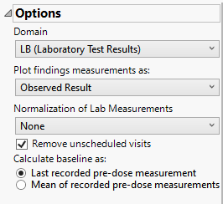 Use this widget to specify whether to plot the distribution of measurements from either the Electrocardiogram (EG), Laboratory (LB), or Vital Signs (VS) findings domains.