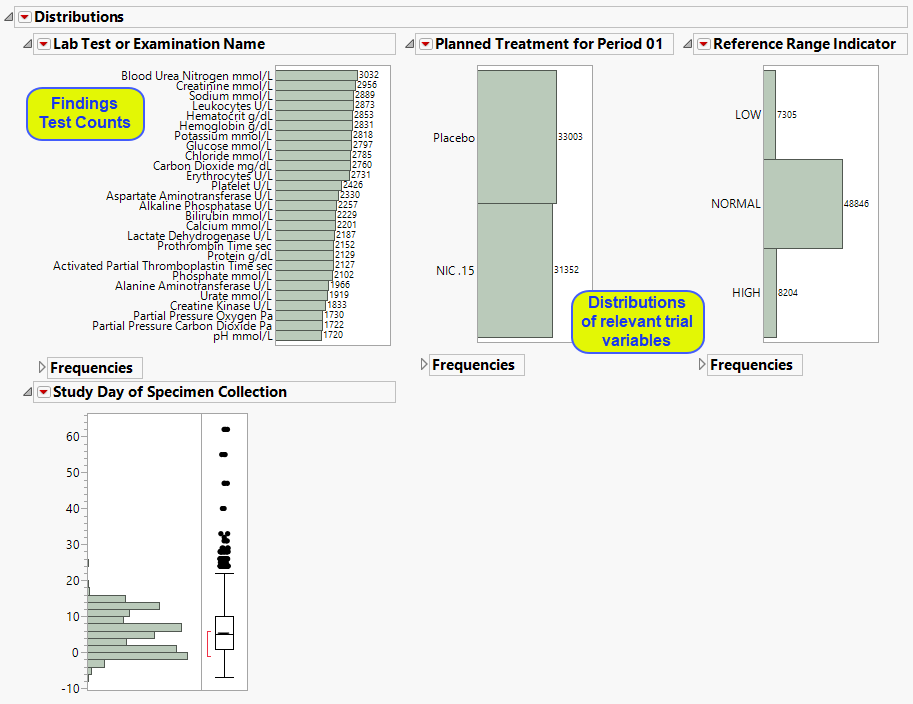 These display counts and histograms of relevant variables in the Findings data set. A distribution of subjects on the Actual, Planned, or Specified Treatment is shown as well as other findings variables (if present). Findings variables displayed can include the Findings Body System (xxBODSYS), Reference Range Indicator1 (xxNRIND), the Category for the Test (xxCAT) and Subcategory (xxSCAT), the Categorical Findings Result (xxSTRESC, only displayed for categorical findings domains), the Visit and Time Points at which findings were taken (VISIT and xxTPT), Baseline Flag (xxBLFL), and the Study Day.