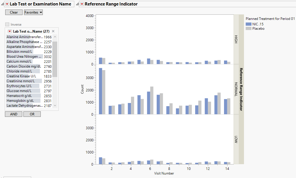 These plots show the distribution of measurements across categories of the Reference Range Indicator variable (xxNRIND). For example, you can see how many laboratory measurements for a given test were categorized as HIGH, NORMAL, or LOW based on values of the Reference Range Upper Limit and Reference Range Lower Limit (LBSTNRLO and LBSTNRHI, respectively). The graph contains bars representing the counts within each category for each treatment across Study Visits (VISIT or VISITNUM).
