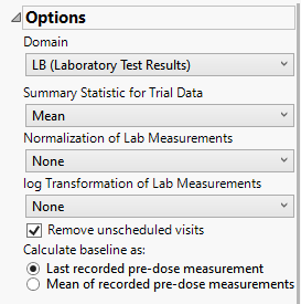 Use this widget to select a normalization to be applied to the baseline and on-therapy measurements. Refer to Normalization of Lab Measurements for more information.