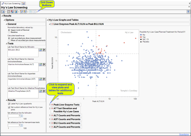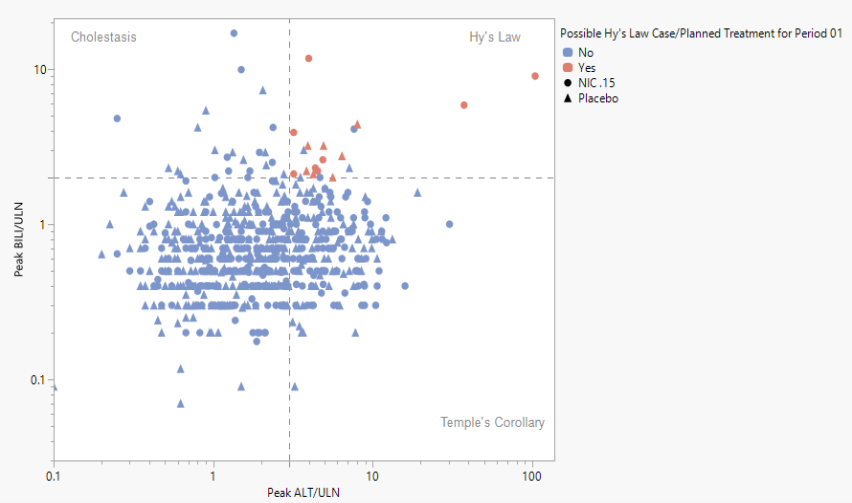 Selecting Label Hy’s Law quadrants places identifying labels, relating to Hy’s law, in each quadrant of all of the plots of bilirubin versus alanine aminotransferase.