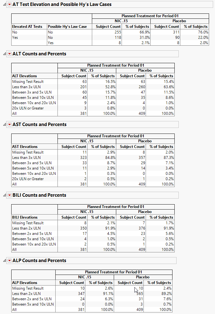Important: The counts and percentages for Missing Test Result on this section are calculated out of all subjects that have at least one nonmissing result for at least one of the liver lab tests. The counts shown on the Hy’s Law Screening section include subjects that had no record or were missing all values for all four liver lab tests.