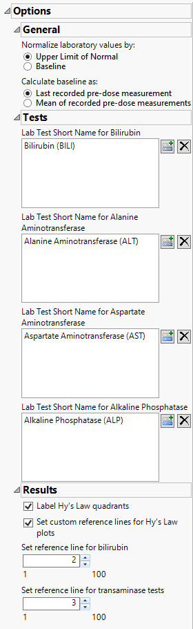 Use the text fields in these widgets to specify the Test Short Name (LBTESTCD ) value that corresponds to each of the tests associated with Hy’s Law screening. These include tests for bilirubin, alanine aminotransferase, aspartate aminotransferase, and alkaline phosphatase. These widgets enable you to specify individual tests when non-standard test names are used in the study. If these options are left blank, JMP Clinical uses the standard test designations.
