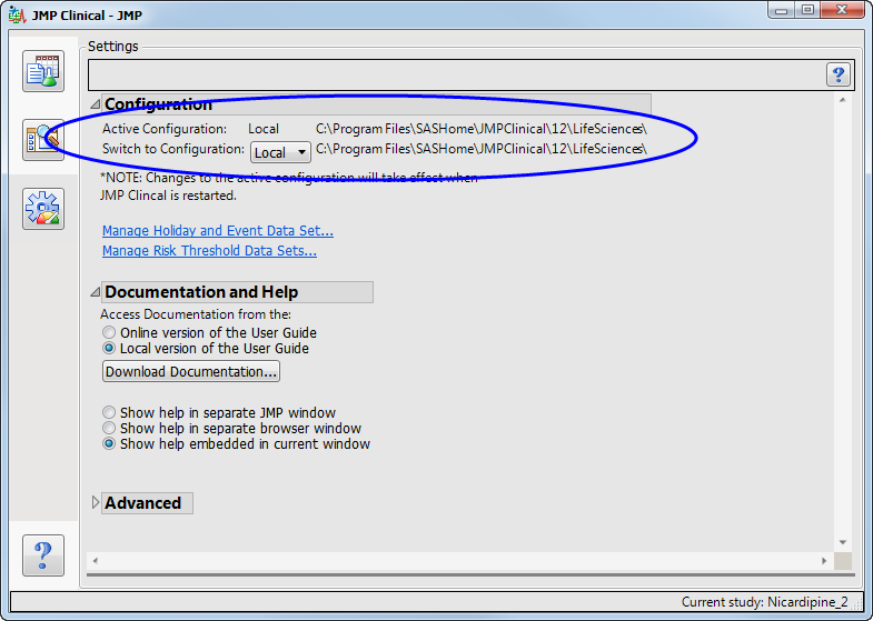 When you re-install JMP Clinical or update to a newer version, you also install a new copy of the installation.configuration.preferences file containing only the default configuration. To restore your previous configurations, delete the new installation.configuration.preferences file, copy, and paste the installation.configuration.preferences.previousbackup file into the C:\Program Files\SASHome\JMPClinical\12\LifeSciences directory and rename it installation.configuration.preferences. Close and reopen JMP Clinical and you should find that your configurations have been restored.