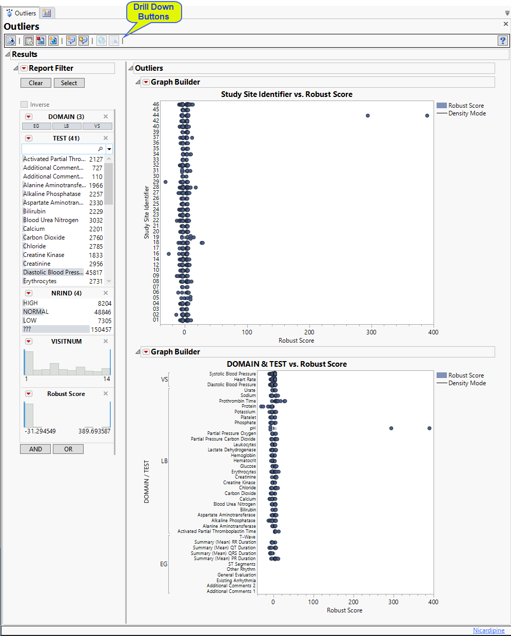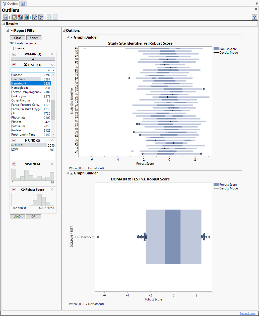 Enables you to filter your data and drill down to look at outliers for specific findings test results. For example, if we click on Hematocrit, we generate the following plots.